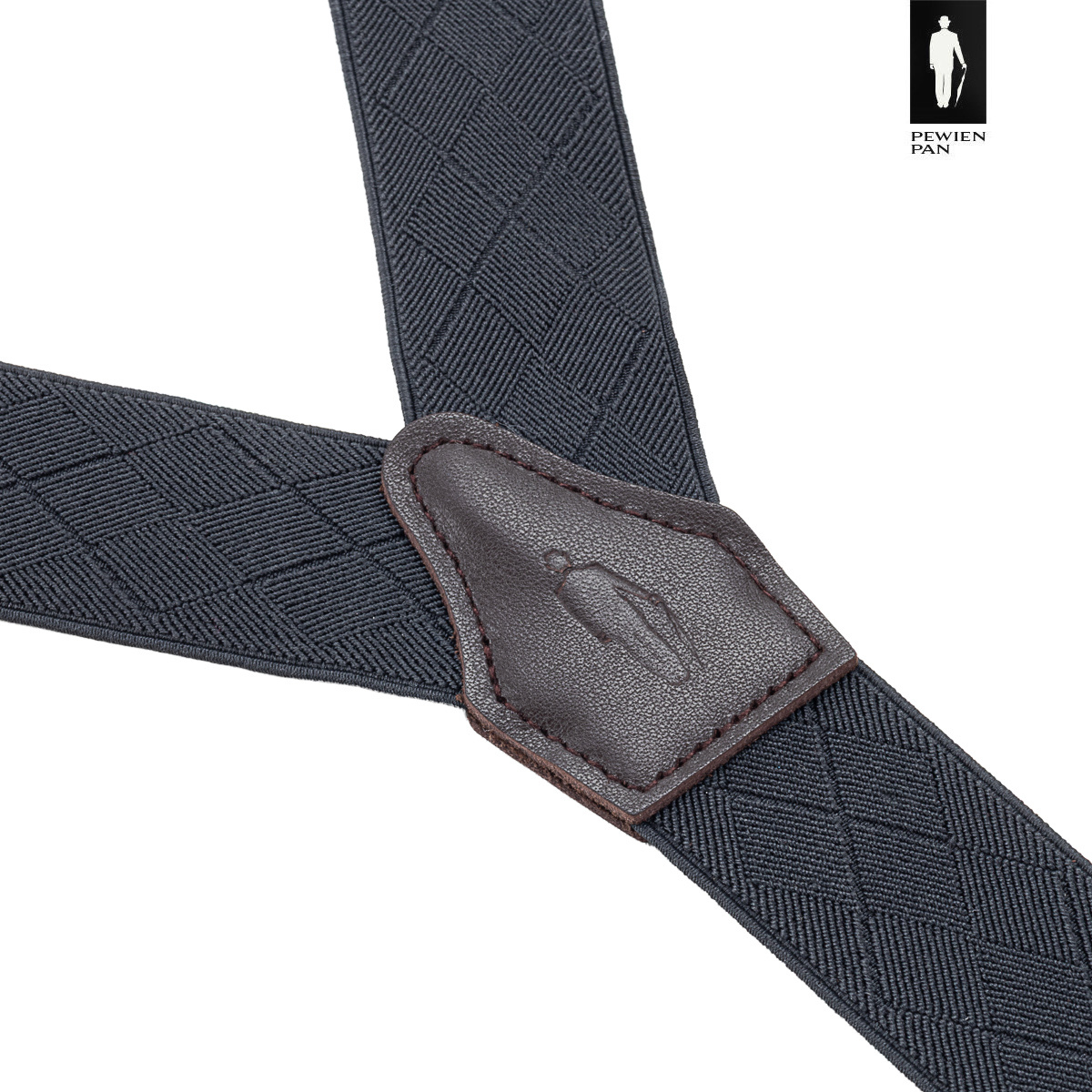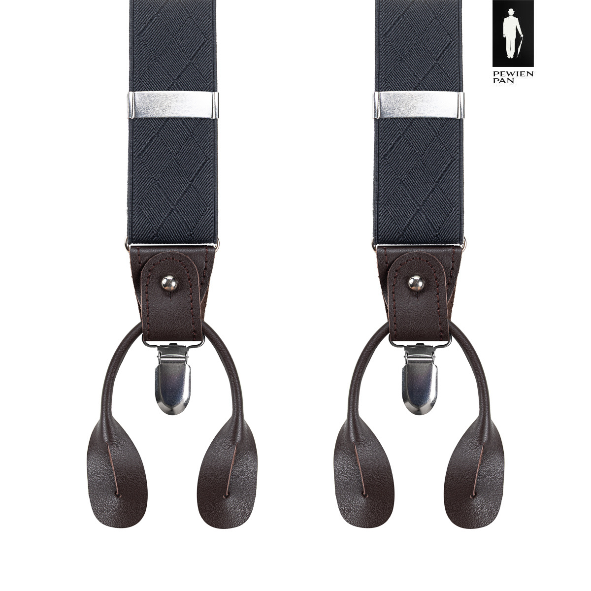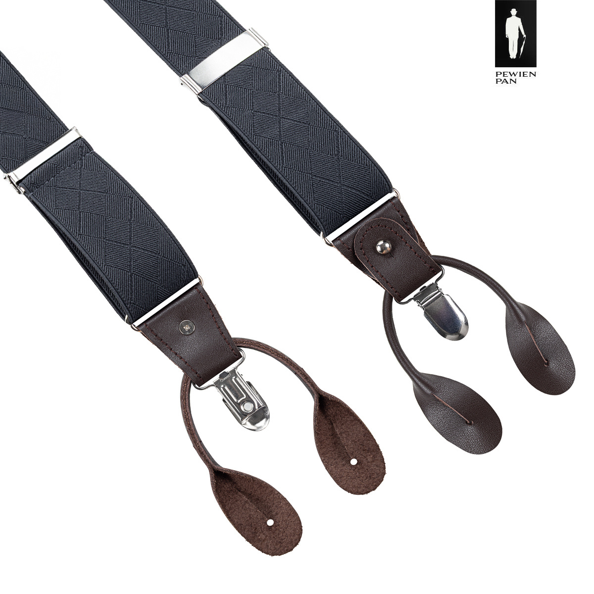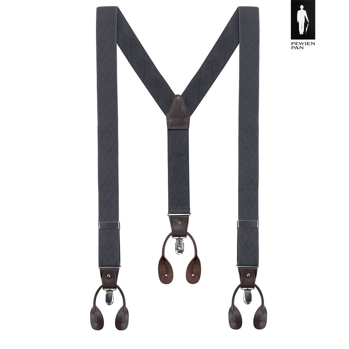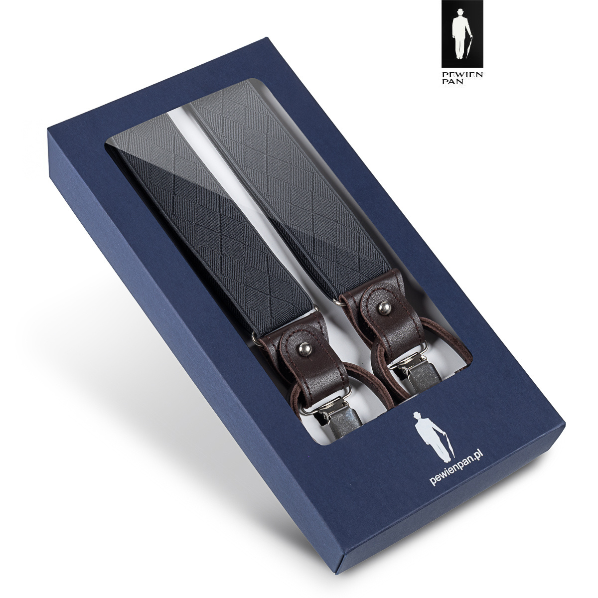 CIemnoszare szelki męskie w romby z podwójnym zapięciem 2w1 to propozycja dla panów, którzy cenią elegancję i komfort. Wykonane zostały w manufakturze z wysokogatunkowej gumy w oplocie o szerokości 3,5 cm, dzięki czemu doskonale trzymają spodnie, nie powodując dyskomfortu podczas noszenia.