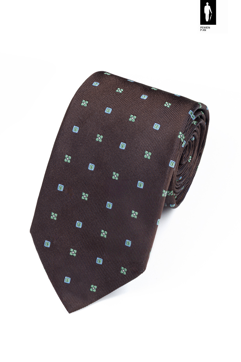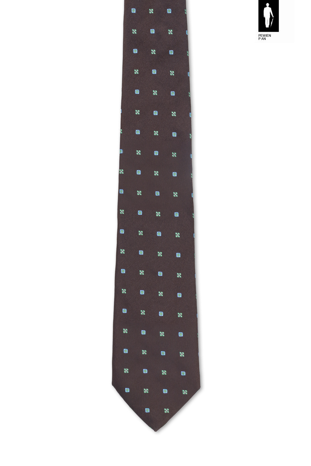 - Klasyczny jedwabny krawat o szerokości 8cm, uszyty w lokalnej manufakturze w Como. Brązowa tkanina ozdobiona zielono-błękitnym mikrowzorem. Wypełnienie z mieszanki wełny, wiskozy i bawełny zapewnia idealne ułożenie.