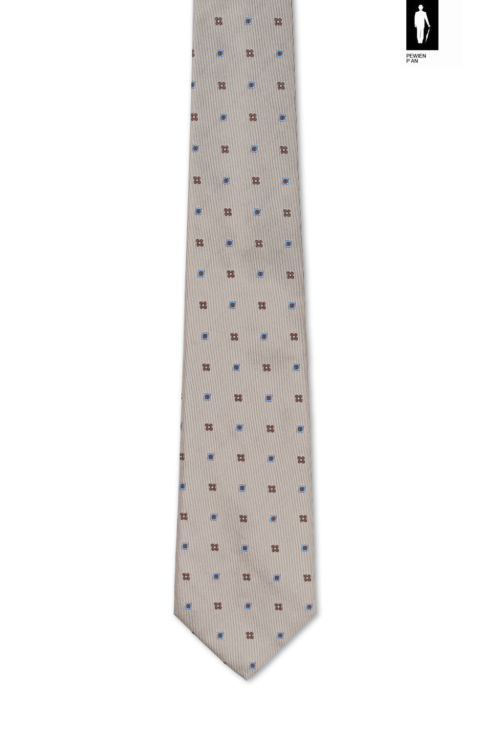 - Beżowy krawat z jedwabiu o szerokości 8cm. Delikatny brązowo-błękitny mikrowzór dodaje mu elegancji. Uszyty w Como z naturalnego jedwabiu i luksusową wkładką z wełny, wiskozy i bawełny.