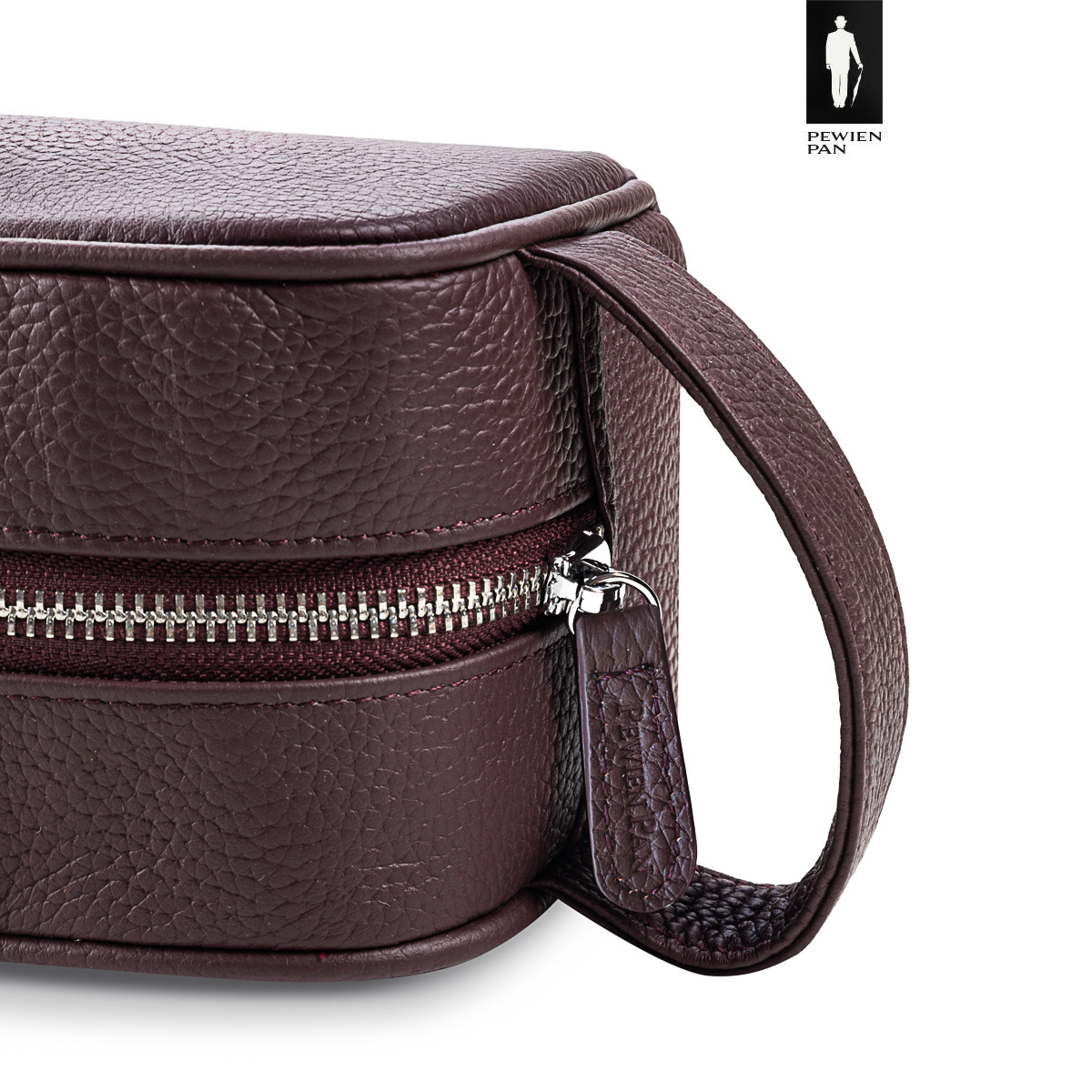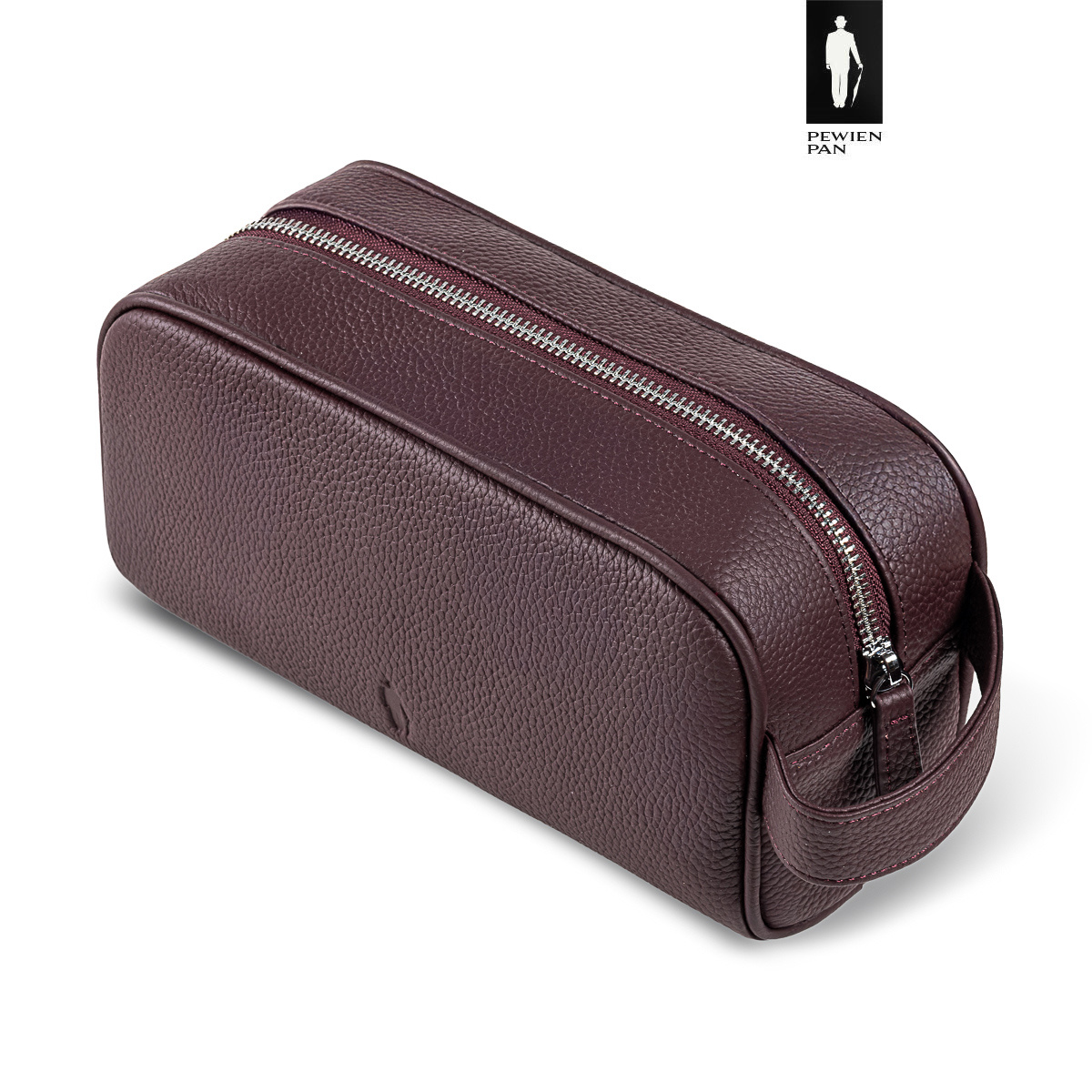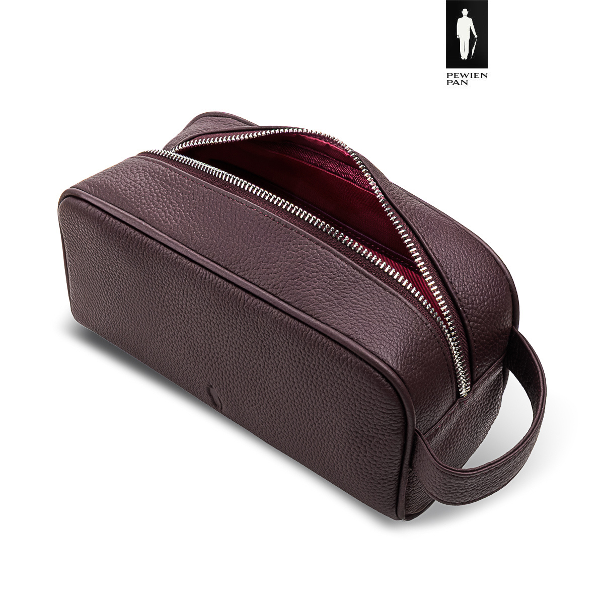 - Elegancka męska kosmetyczka ze skóry naturalnej o wyrazistym ziarnie, z bordową podszewką i praktycznym wnętrzem.