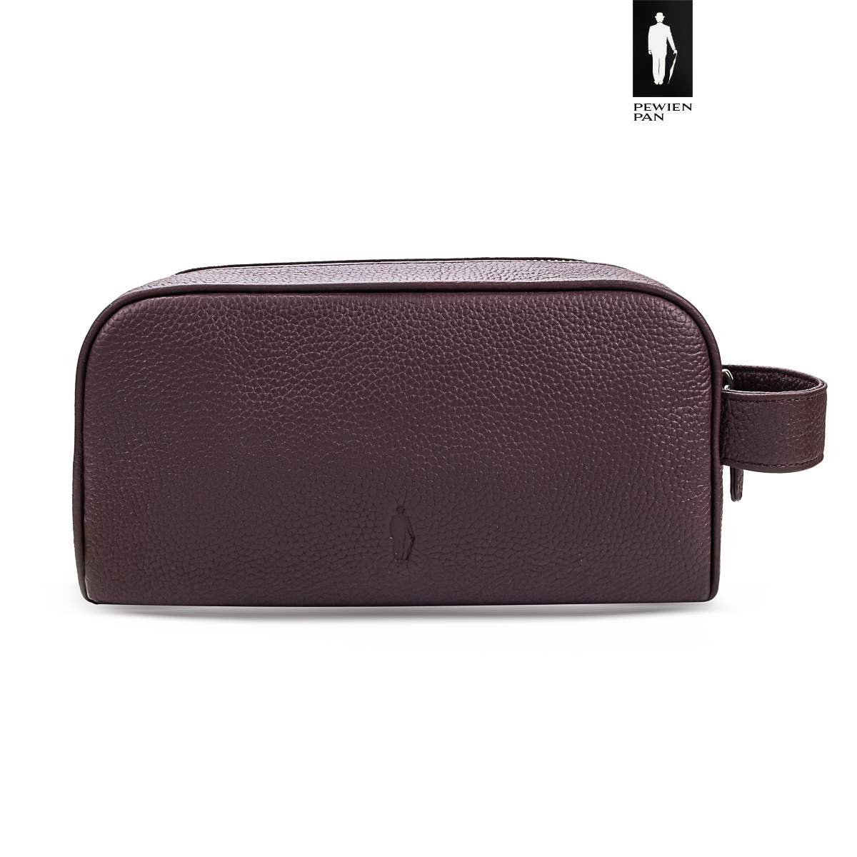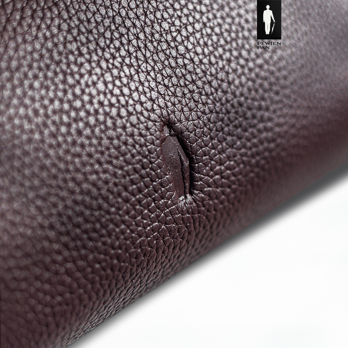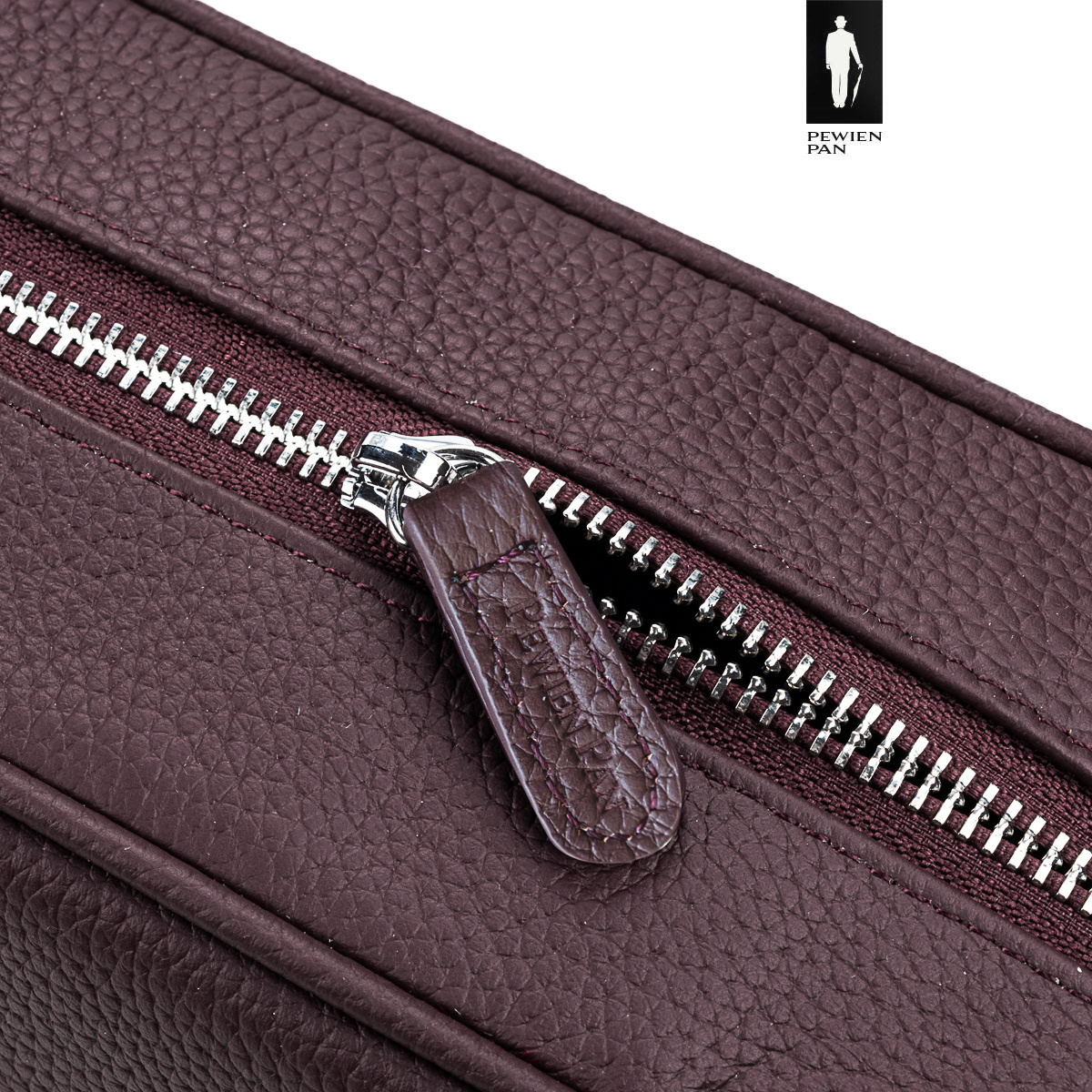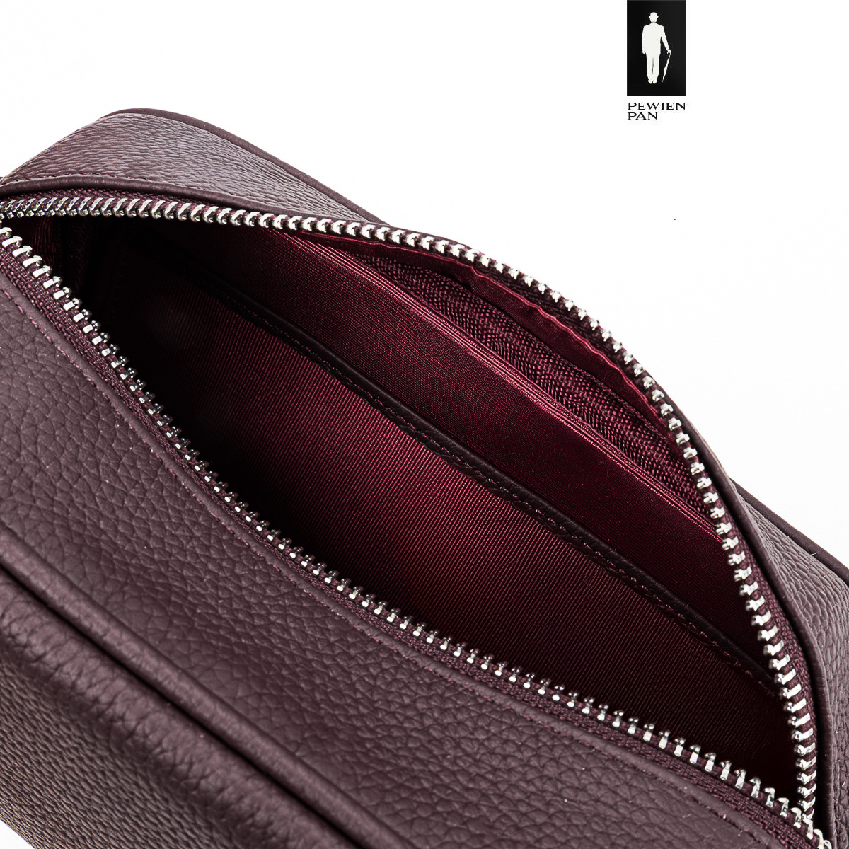 - Elegancka męska kosmetyczka ze skóry naturalnej o wyrazistym ziarnie, z bordową podszewką i praktycznym wnętrzem.