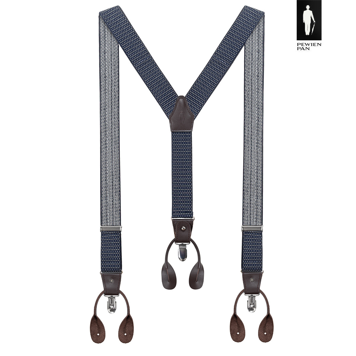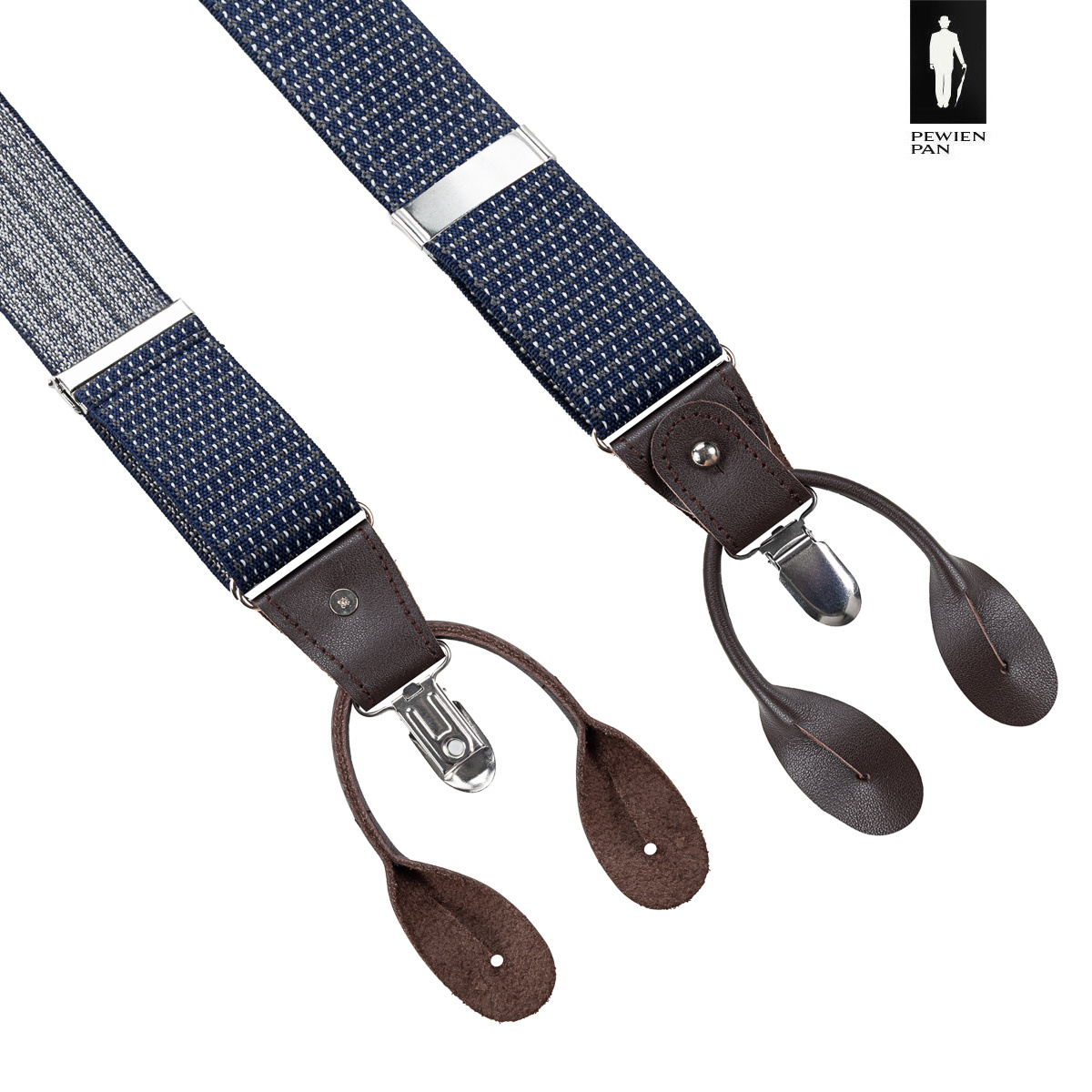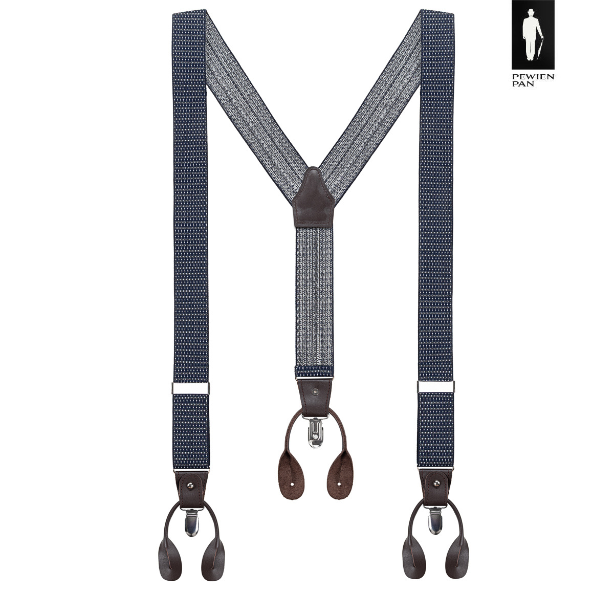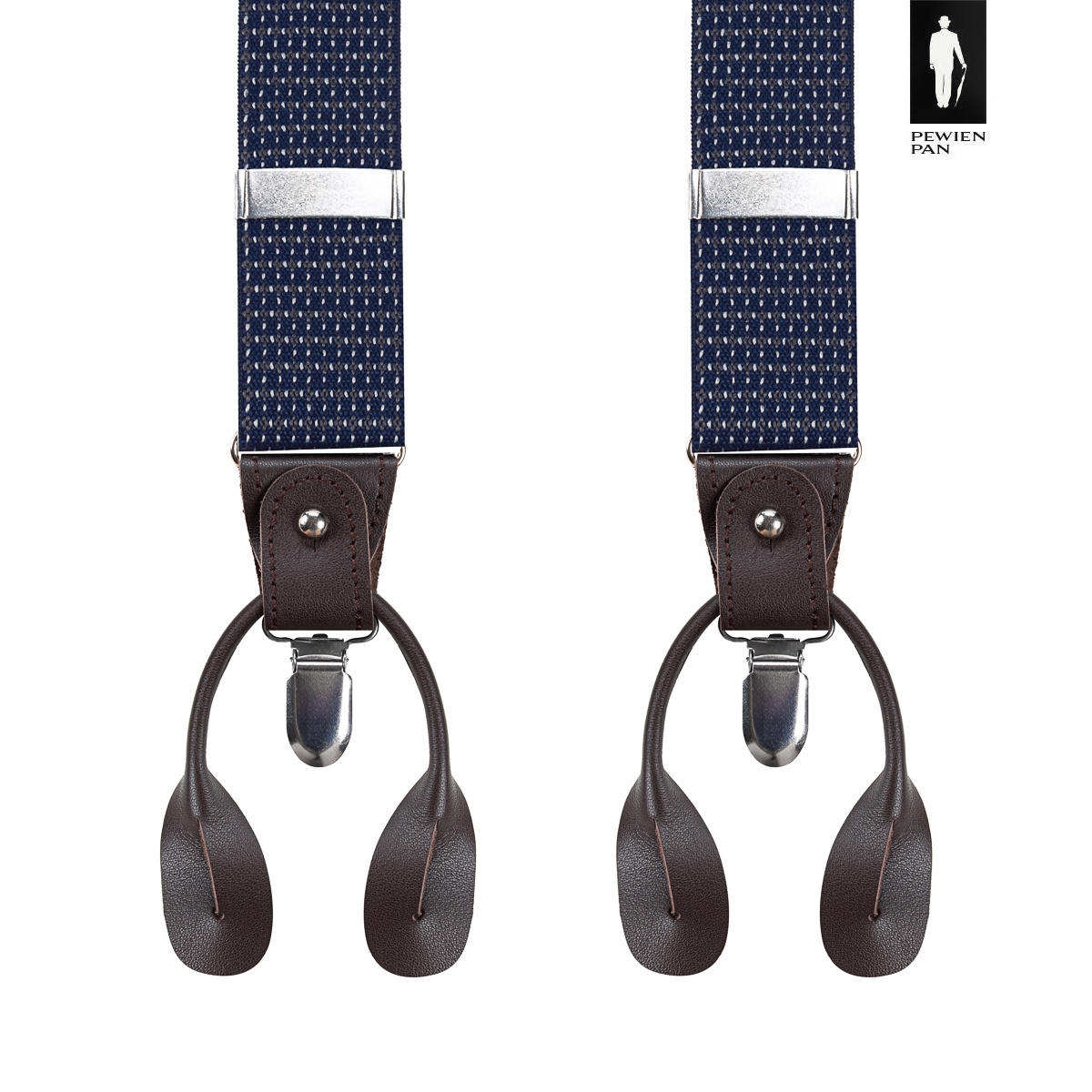• Granatowe szelki męskie z eleganckim mikrowzorem. Wyposażone w podwójny system zapięcia – na guziki lub metalowe klamerki.