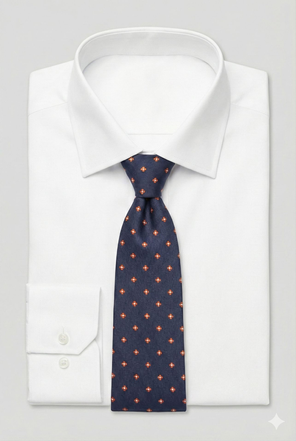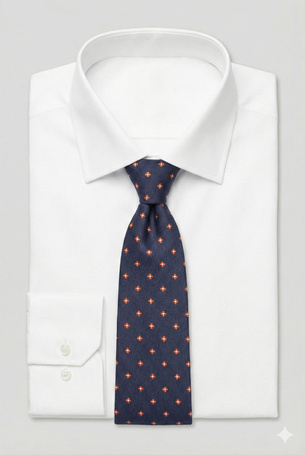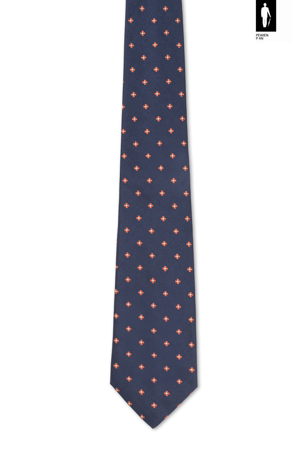 Granatowy jedwabny krawat z pomarańczowym mikrowzorem to połączenie klasyki i subtelnej odwagi, charakterystyczne dla włoskiego stylu. Został wykonany w lokalnej manufakturze w Como – miejscu, które od pokoleń słynie z produkcji najwyższej jakości jedwabi.