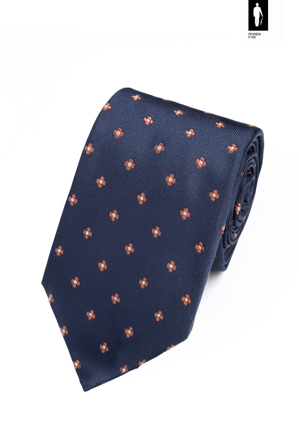Wzór w ciepłym odcieniu pomarańczu przełamuje głęboki granat tkaniny, tworząc elegancki kontrast, który podkreśla indywidualny charakter stylizacji. Wnętrze krawata wypełnia starannie dobrana wkładka z wełny, wiskozy i bawełny, zapewniająca idealne ułożenie oraz trwałość wiązania.