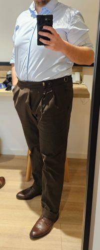 Po raz pierwszy w naszej kolekcji bawełniane spodnie z wysokim stanem i przednimi zakładkami. Przedłużany szeroki pasek 5,5 cm wizualnie wyszczupla sylwetkę. Na prawym przodzie kieszonka zegarkowa zamykana patką. Na bokach paska regulatory pozwalające na dopasowanie obwodu. Od spodu paska doszyliśmy guziki pozwalające na dopięcie szelek. Wysoki stan, przednie zakładki oraz tkanina z dodatkiem elastanu sprawiają, że spodnie są bardzo wygodne.