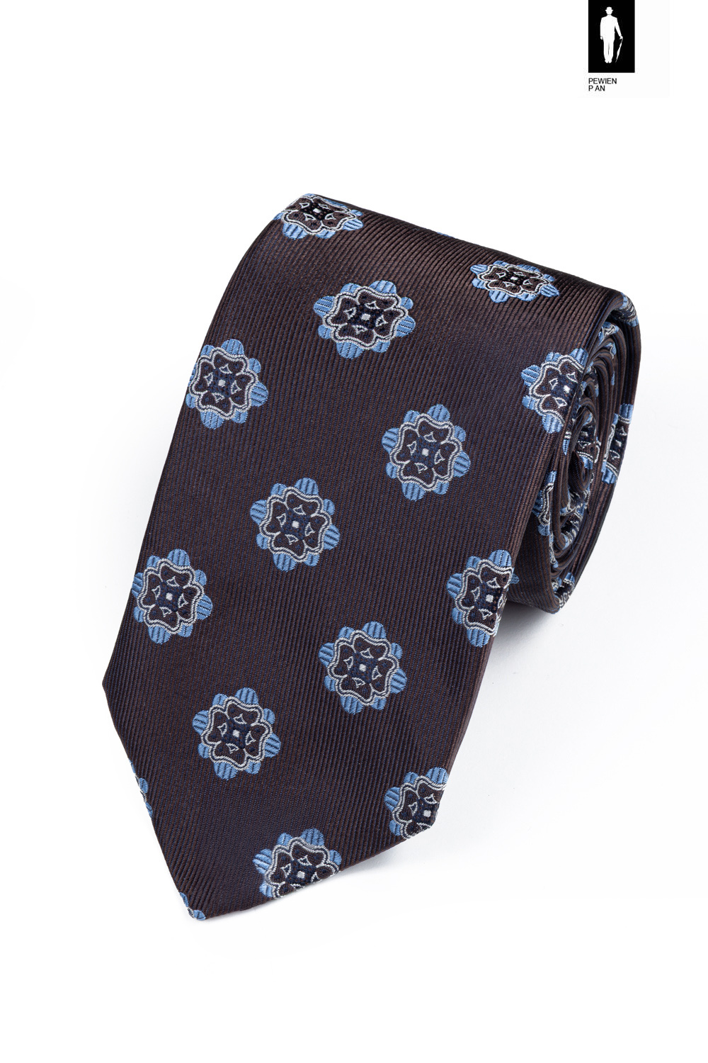 - Brązowy krawat z jedwabiu o szerokości 8cm. Ozdobiony błękitno-białym wzorem w stylu włoskim. Wyprodukowany w Como z wkładką z wełny, wiskozy i bawełny.