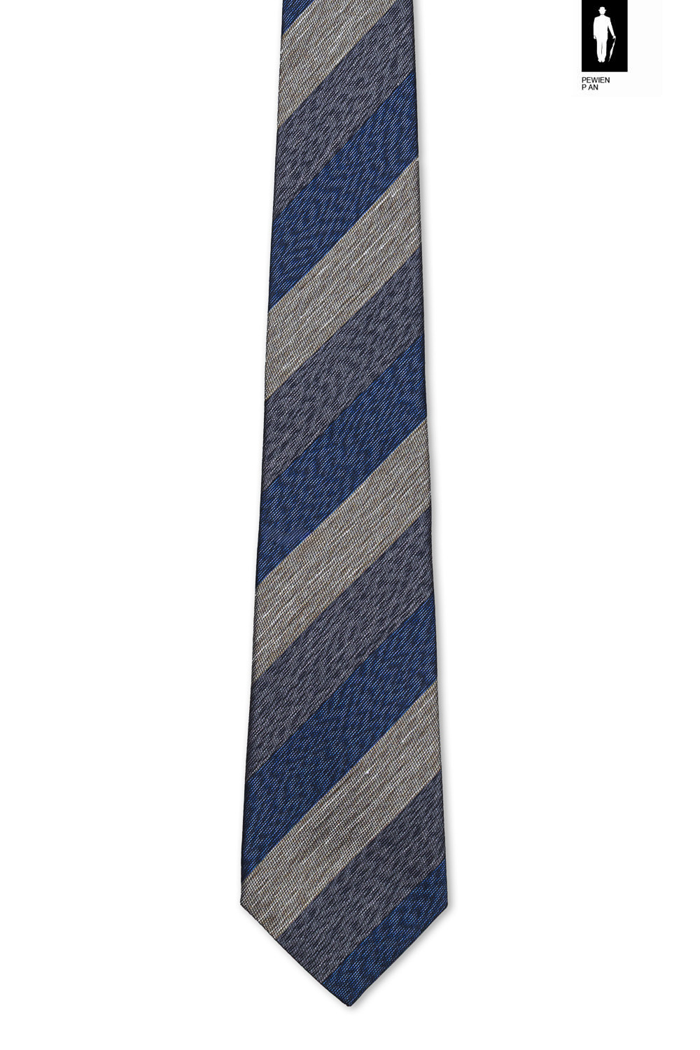 Wyraźne skośne pasy w odcieniach granatu, szarości i beżu tworzą dynamiczną, ale stonowaną kompozycję, która doskonale ożywia garnitur lub marynarkę. Krawat ma klasyczną szerokość 8 cm, co zapewnia jego uniwersalne zastosowanie – od formalnych okazji po stylizacje smart casual.