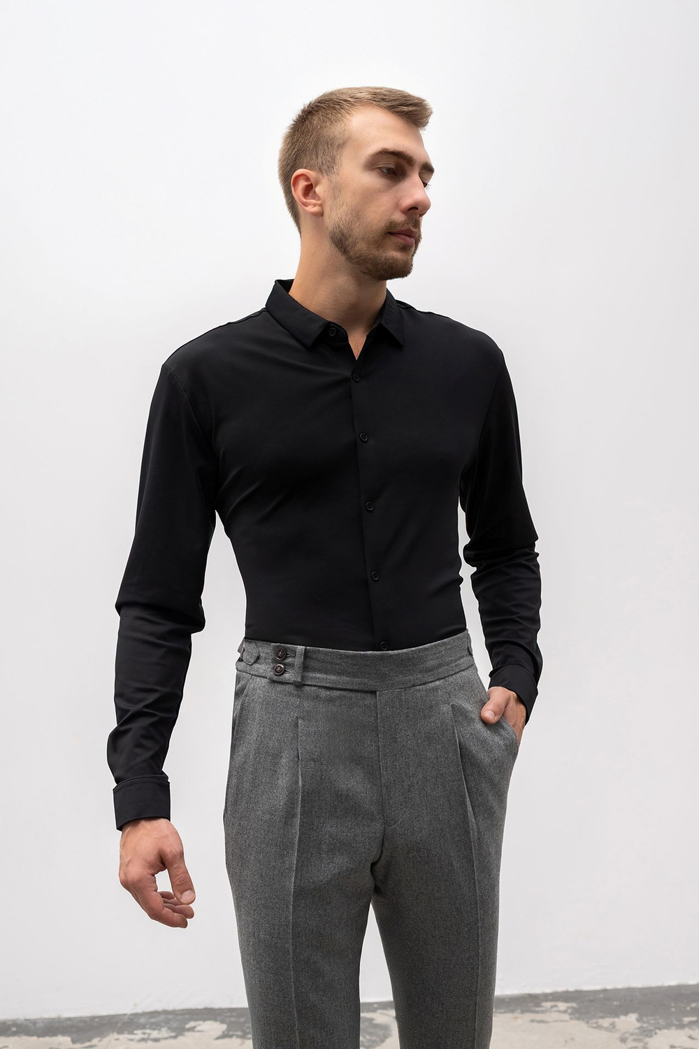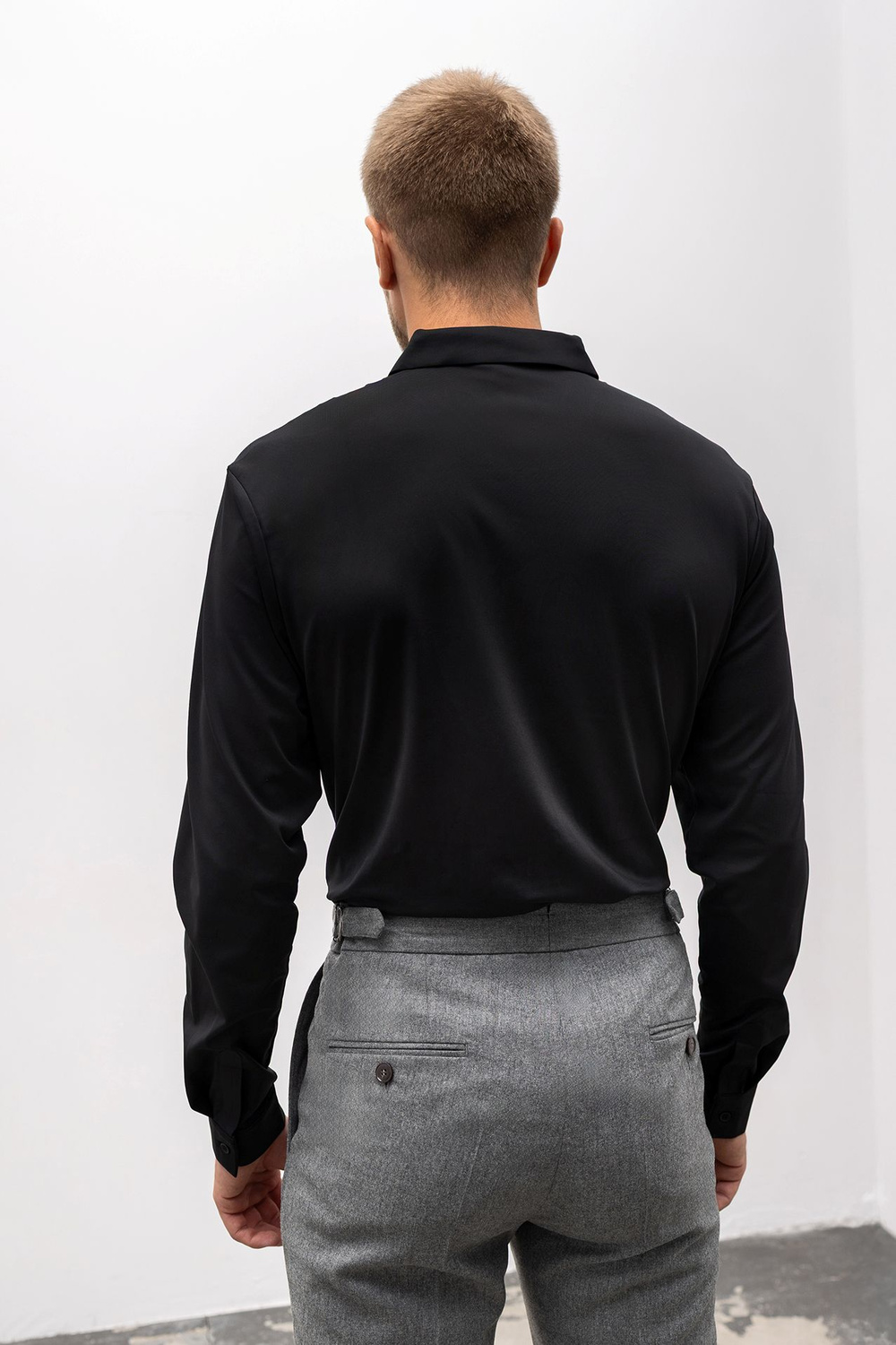 Mały kołnierzyk i długi rękaw nadają jej nowoczesnego, eleganckiego charakteru. Głęboki odcień czerni jest uniwersalny i ponadczasowy — sprawdzi się zarówno w stylizacjach biznesowych, jak i codziennych. Koszula doskonale komponuje się z beżowymi chinosami, szarymi spodniami garniturowymi czy klasycznymi jeansami.