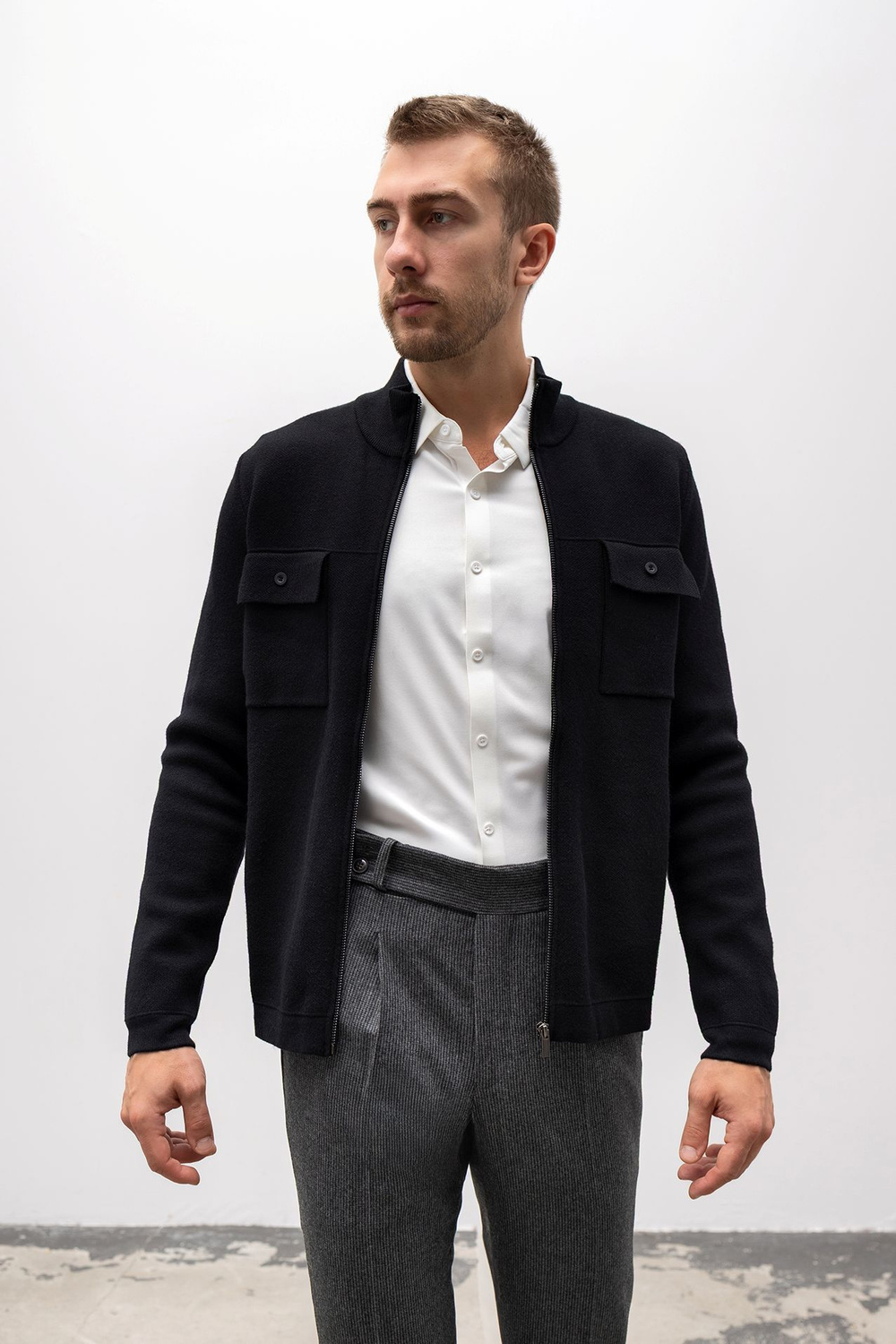 Czarny sweter męski zapinany na zamek to połączenie ponadczasowego minimalizmu i subtelnych inspiracji militarnych. Uszyty z wysokogatunkowej dzianiny o składzie 52% wiskoza, 27% bawełna i 21% nylon, łączy w sobie miękkość, elastyczność i wyjątkową trwałość.
