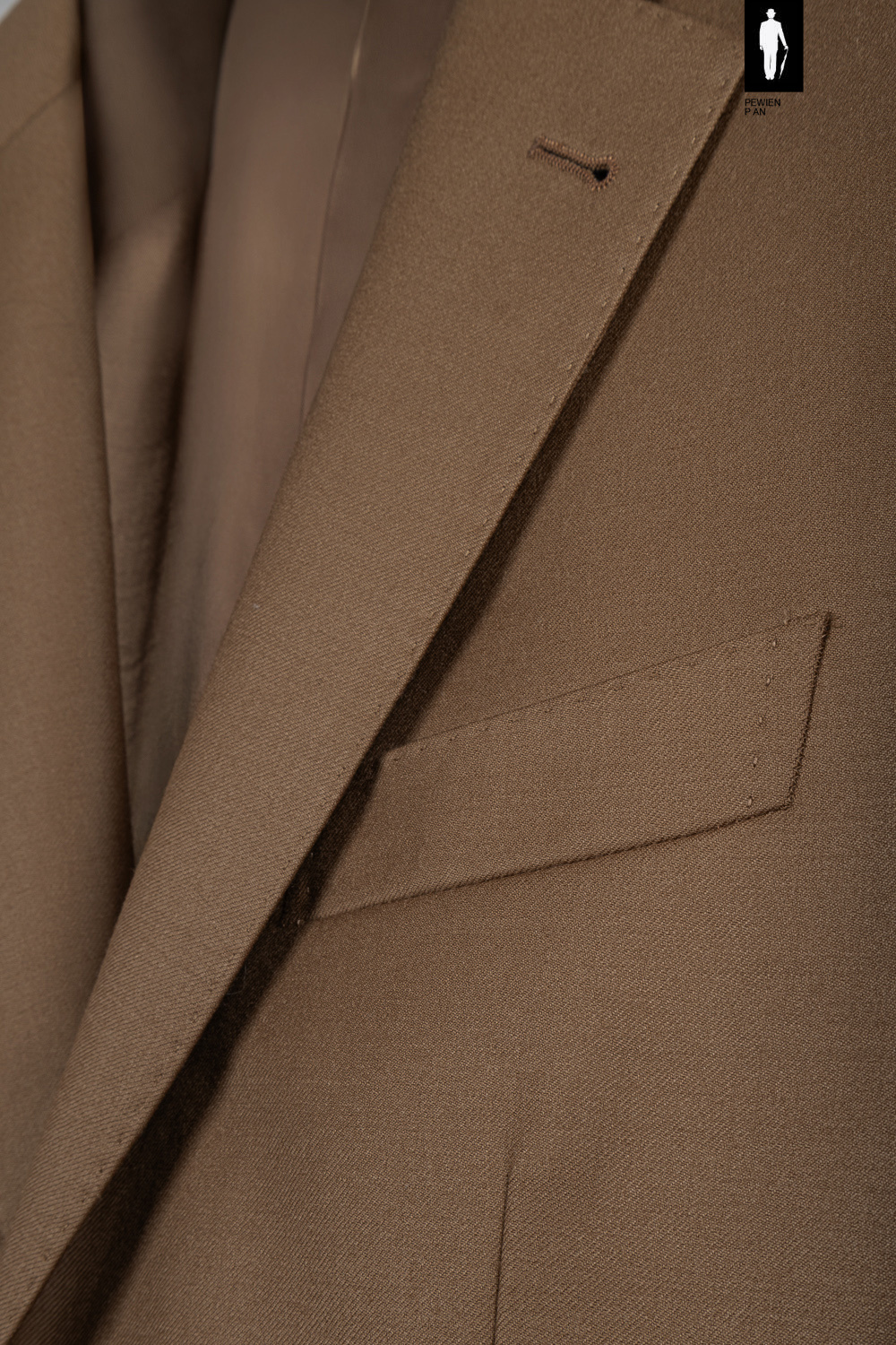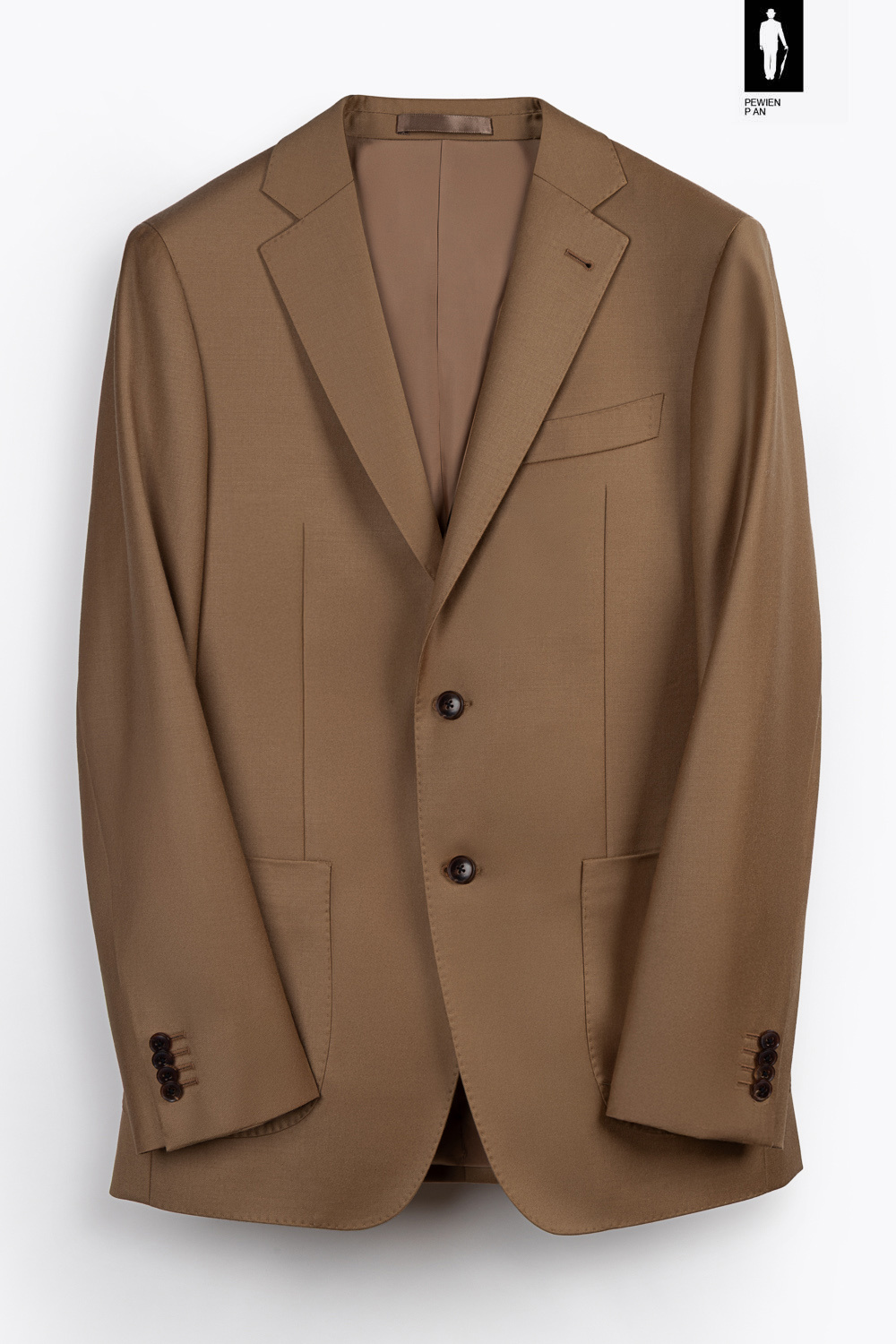 Konstrukcja na pół płótnie sprawia, że marynarka pracuje z ciałem i z czasem dopasowuje się do sylwetki. Ramiona mają delikatne wypełnienie, a rękawy wszyte są metodą spalla camicia, charakterystyczną dla włoskich mistrzów krawiectwa – dzięki temu linia ramienia pozostaje naturalna i miękka.