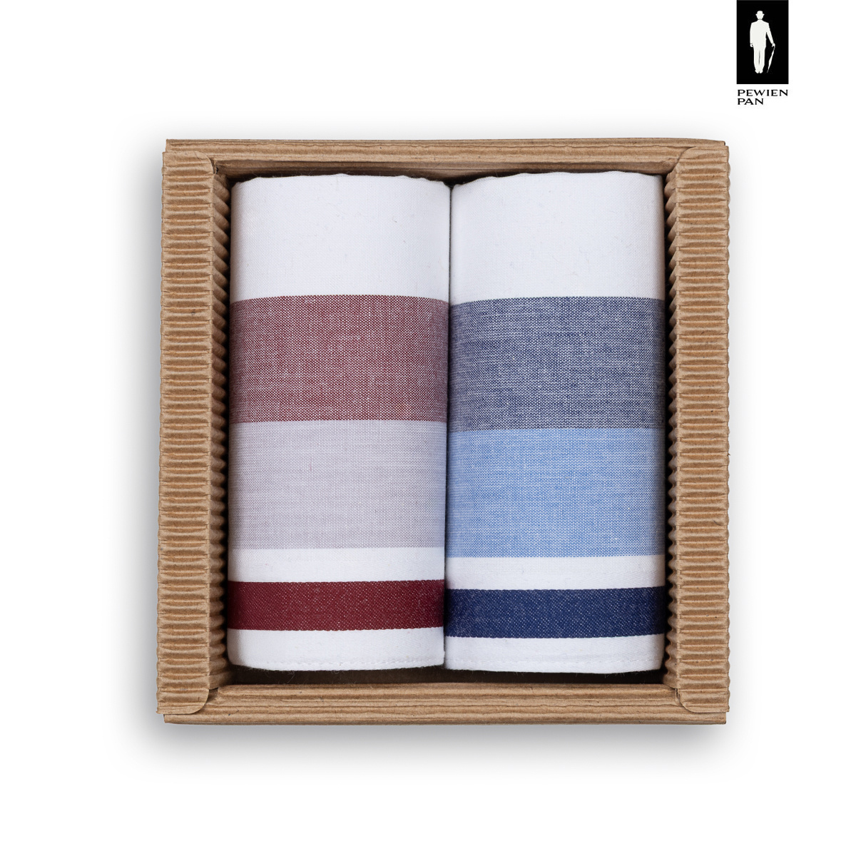 - Zestaw dwóch eleganckich, bawełnianych chusteczek w szerokie pasy w kolorach niebiesko-granatowym i szaro-bordowym. Ponadczasowy styl i wysoka jakość.