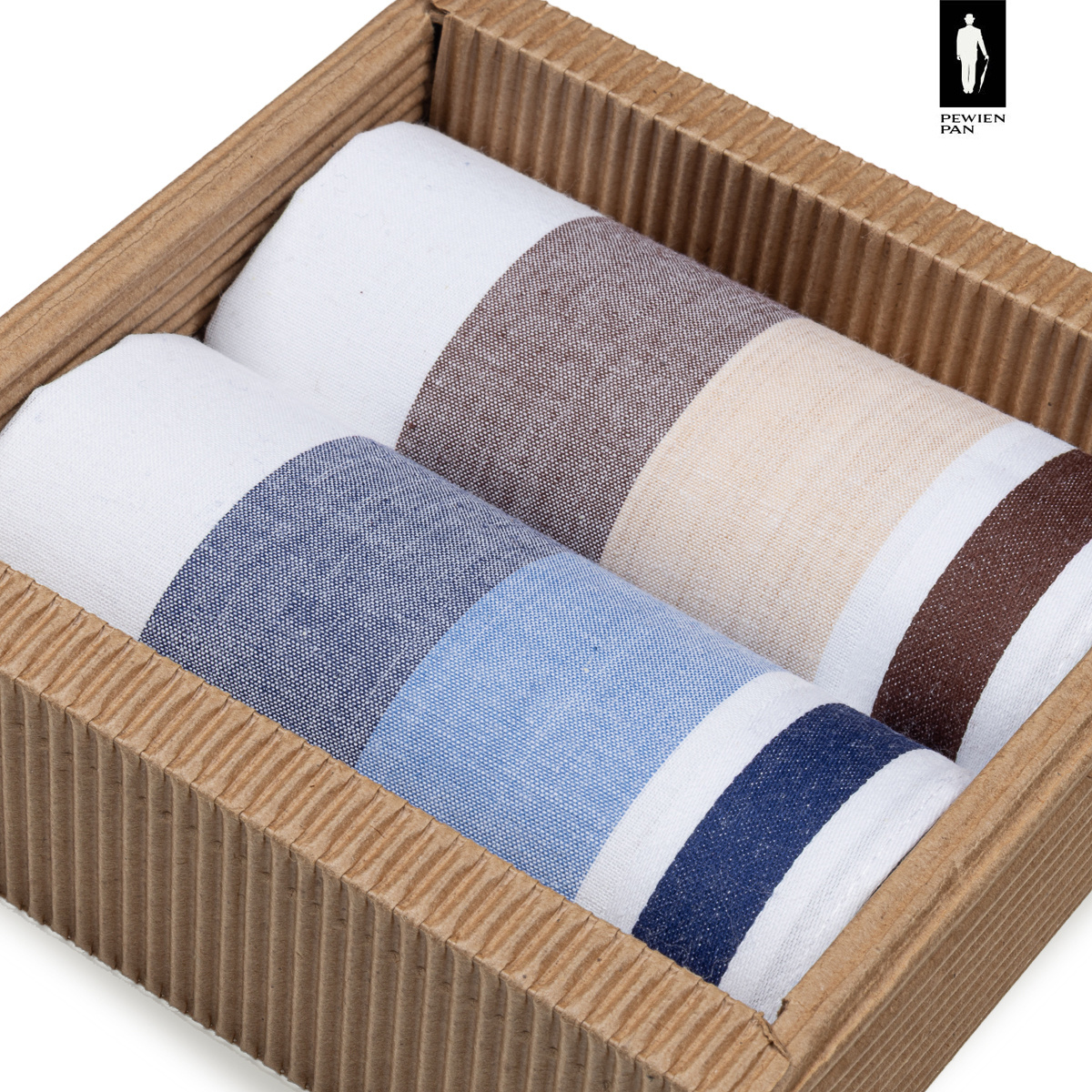 w niebiesko-granatowe oraz beżowo-brązowe szerokie pasyStylowe i ponadczasowe – bawełniane chusteczki męskie w szerokie pasy to klasyczny dodatek, który łączy praktyczność z elegancją. W zestawie znajdują się dwie chusteczki o wymiarach 40 × 40 cm, wykonane w 100% z miękkiej i wytrzymałej bawełny. Tkanina jest przyjemna w dotyku, dobrze chłonie wilgoć i zachowuje swoją formę przez długi czas.