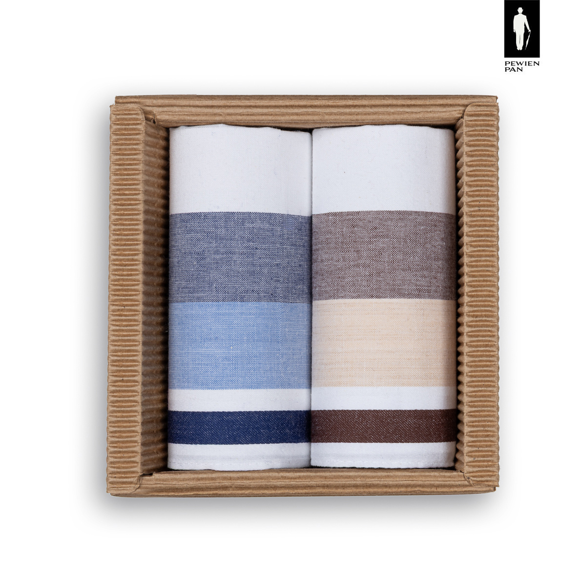 - Zestaw dwóch eleganckich chusteczek z bawełny, w szerokie pasy: niebiesko-granatowe i beżowo-brązowe.