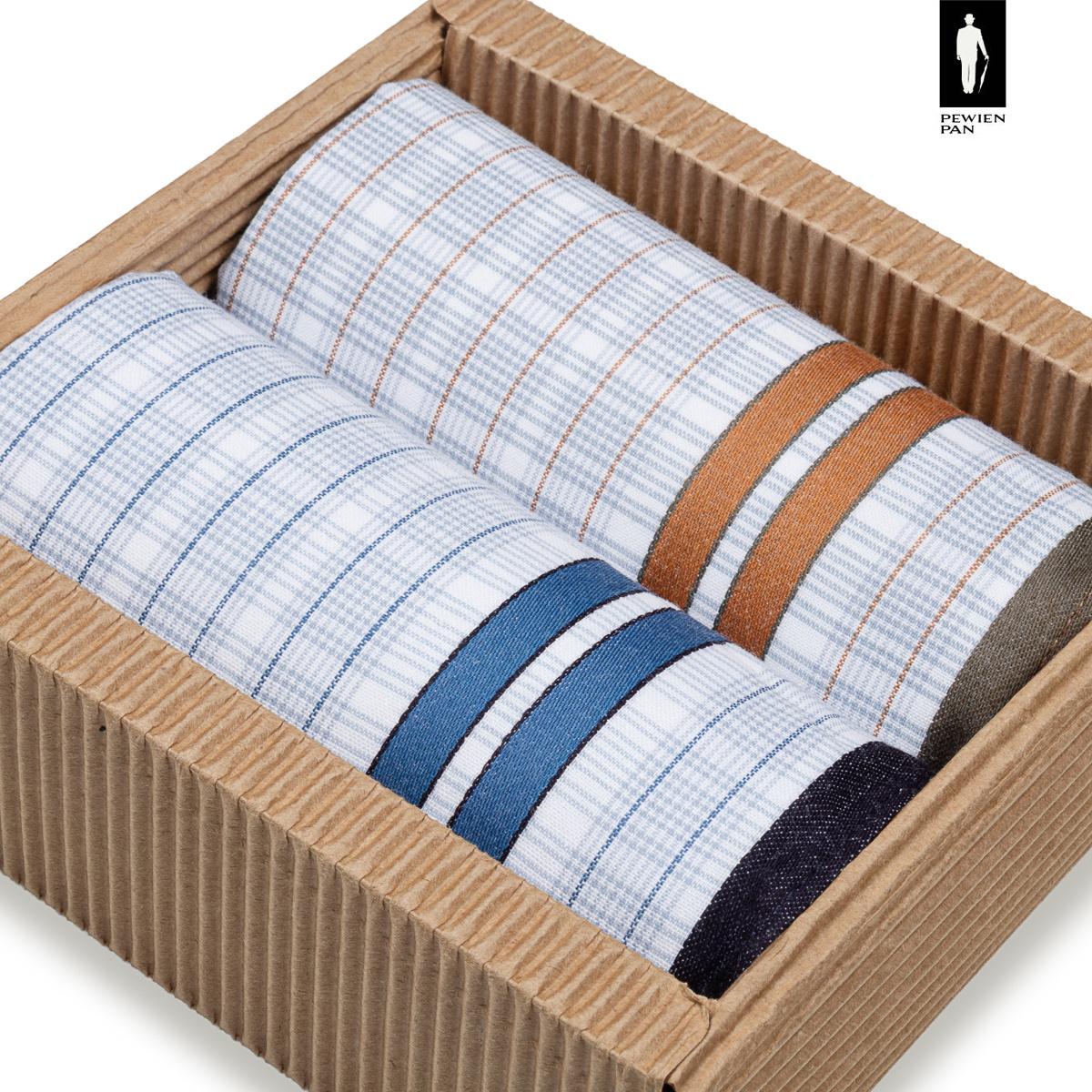 Połączenie tych dwóch wzorów sprawia, że zestaw jest doskonały zarówno do codziennych stylizacji, jak i jako drobny, estetyczny prezent. Subtelna kratka na białym tle nawiązuje do tradycyjnych chusteczek dżentelmenów, a kolorowe paski nadają im nowoczesnego wykończenia.
