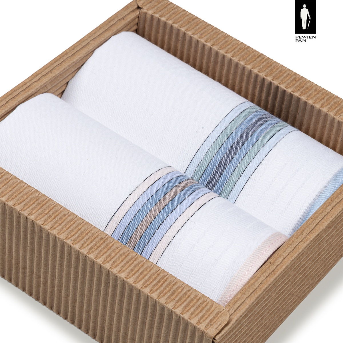 w różowe oraz błękitne paskiDelikatne, eleganckie i ponadczasowe – bawełniane chusteczki męskie w paski to praktyczny dodatek o klasycznym charakterze. W zestawie znajdują się dwie chusteczki 40 × 40 cm, wykonane z wysokiej jakości 100% bawełny, która zapewnia miękkość, dobrą chłonność oraz trwałość.