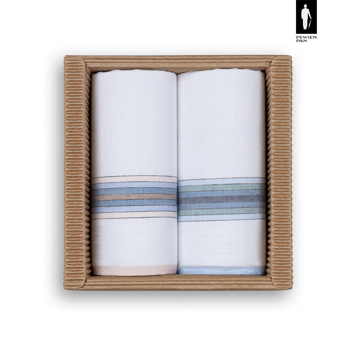 - Zestaw dwóch eleganckich chusteczek w paski – delikatny róż i klasyczny błękit.