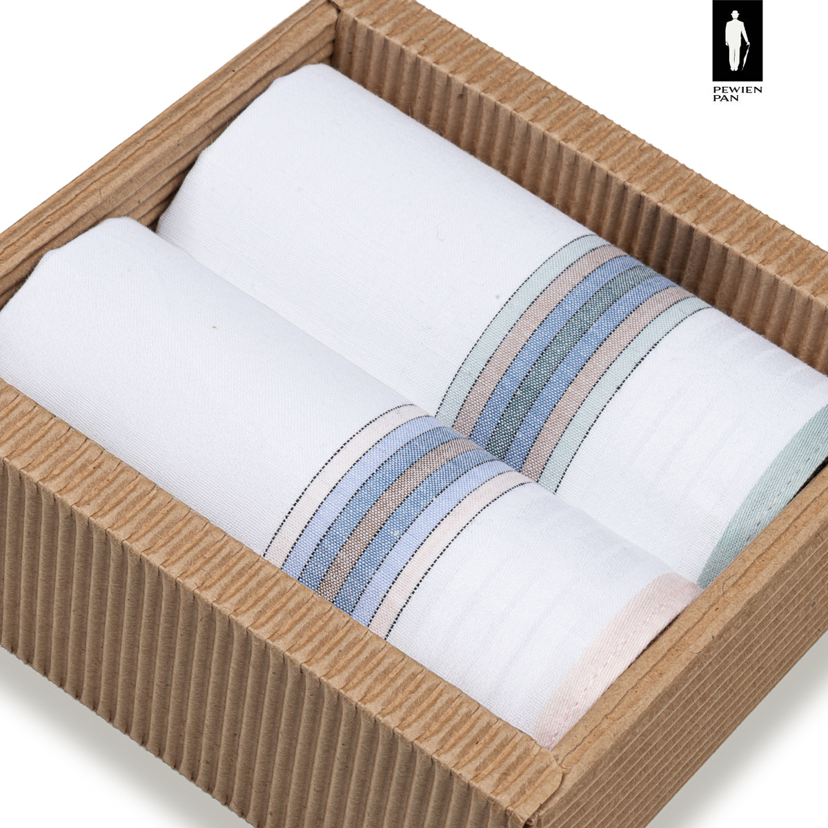 Subtelne, lekkie i eleganckie – bawełniane chusteczki męskie w pastelowe paski to połączenie klasyki i świeżości. W zestawie znajdują się dwie chusteczki o wymiarach 40 × 40 cm, wykonane z wysokogatunkowej, miękkiej i chłonnej 100% bawełny, która zapewnia komfort oraz trwałość w codziennym użytkowaniu.