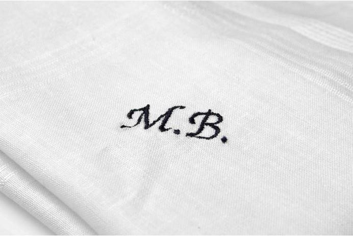 Aby spersonalizować chusteczki możesz zamówić wykonanie haftowanego monogramu. Na widocznym w pudełku brzegu chusteczki wykonamy inicjały. Ich treść podaj nam w miejscu na komentarz do zamówienia. Wybierzemy kolor nici tak, aby monogram pasował do chusteczek. Możesz także wskazać kolor haftu według własnych preferencji.