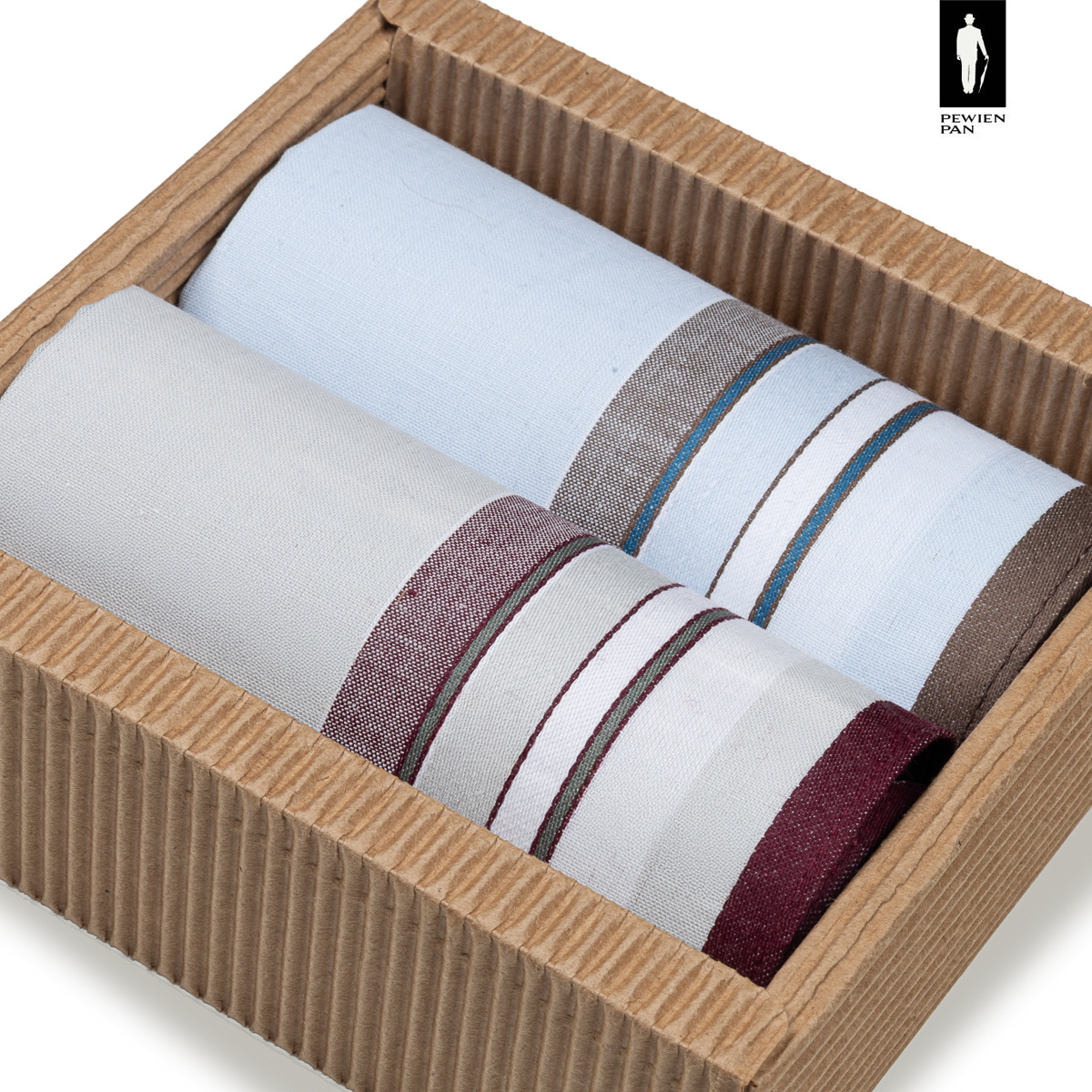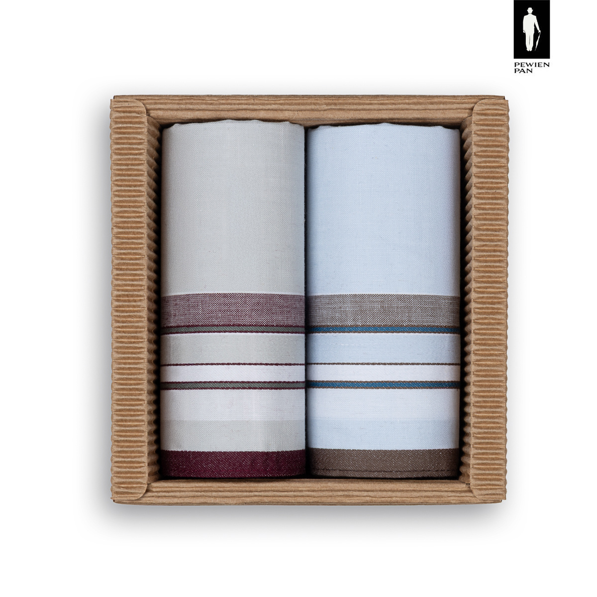 - Zestaw dwóch eleganckich chusteczek w paski – szaro-bordowa i błękitno-brązowa.
