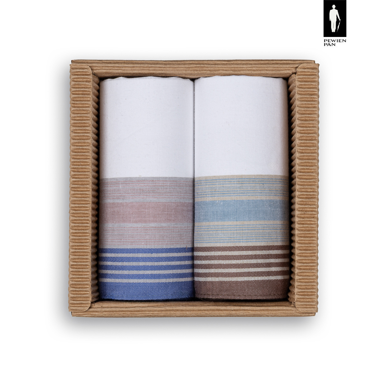 - Zestaw dwóch eleganckich chusteczek w paski – błękitno-czerwona i oliwkowo-brązowa.