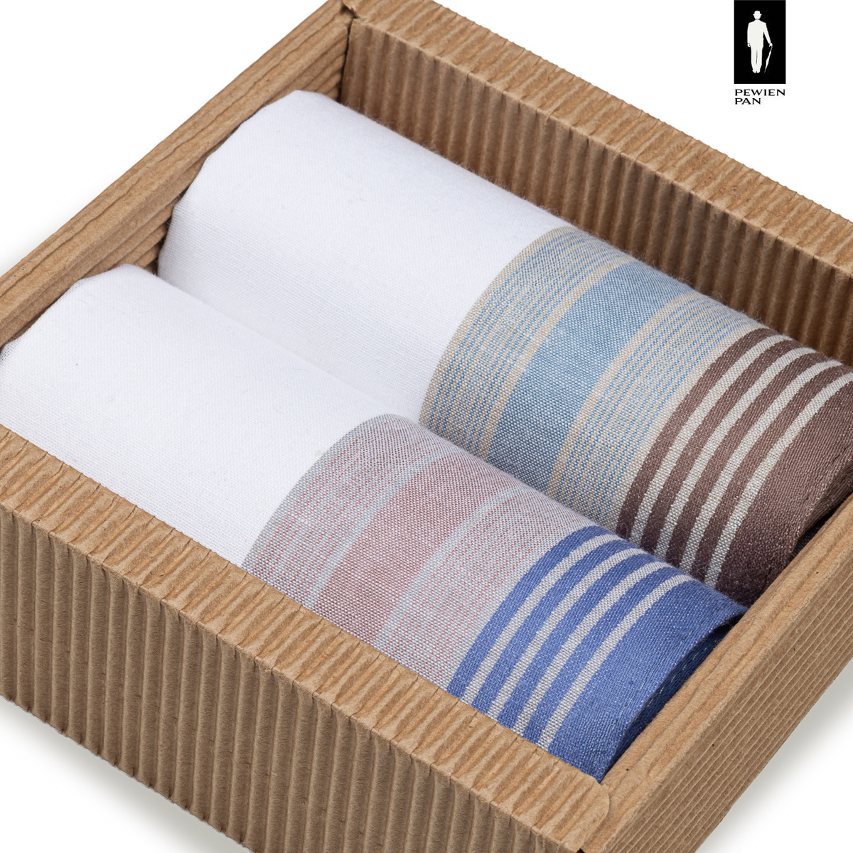 w błękitno-czerwone oraz oliwkowo-brązowe paskiKlasyczne, stonowane i praktyczne – bawełniane chusteczki męskie w paski to dodatek, który nigdy nie wychodzi z mody. W zestawie znajdują się dwie chusteczki o wymiarach 40 × 40 cm, wykonane z naturalnej 100% bawełny, gwarantującej komfort, chłonność oraz trwałość.