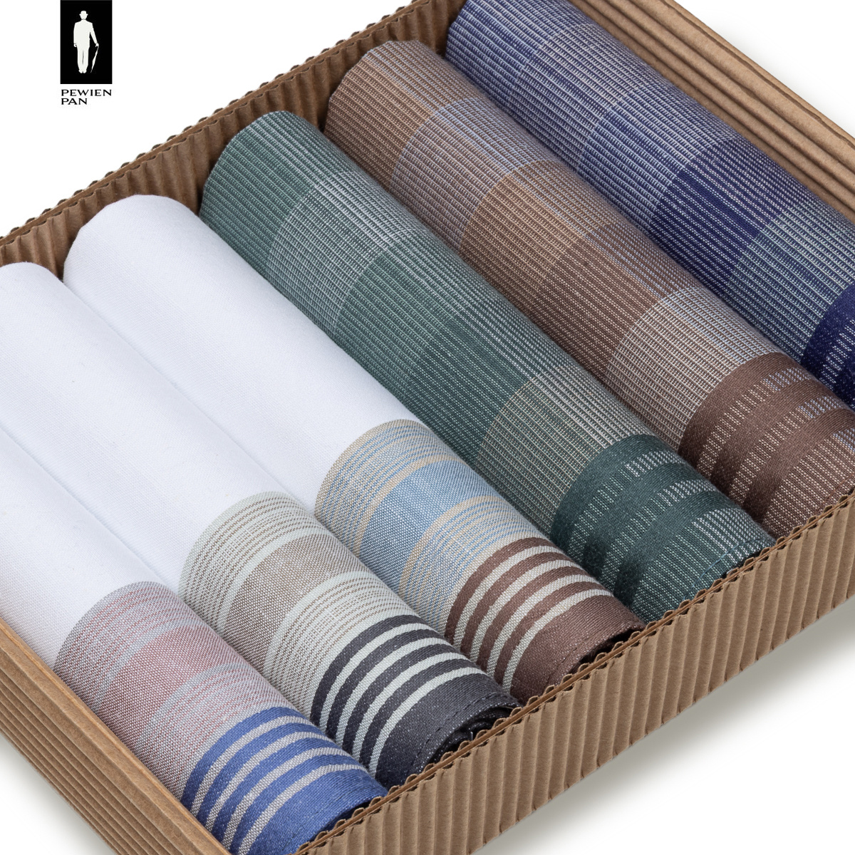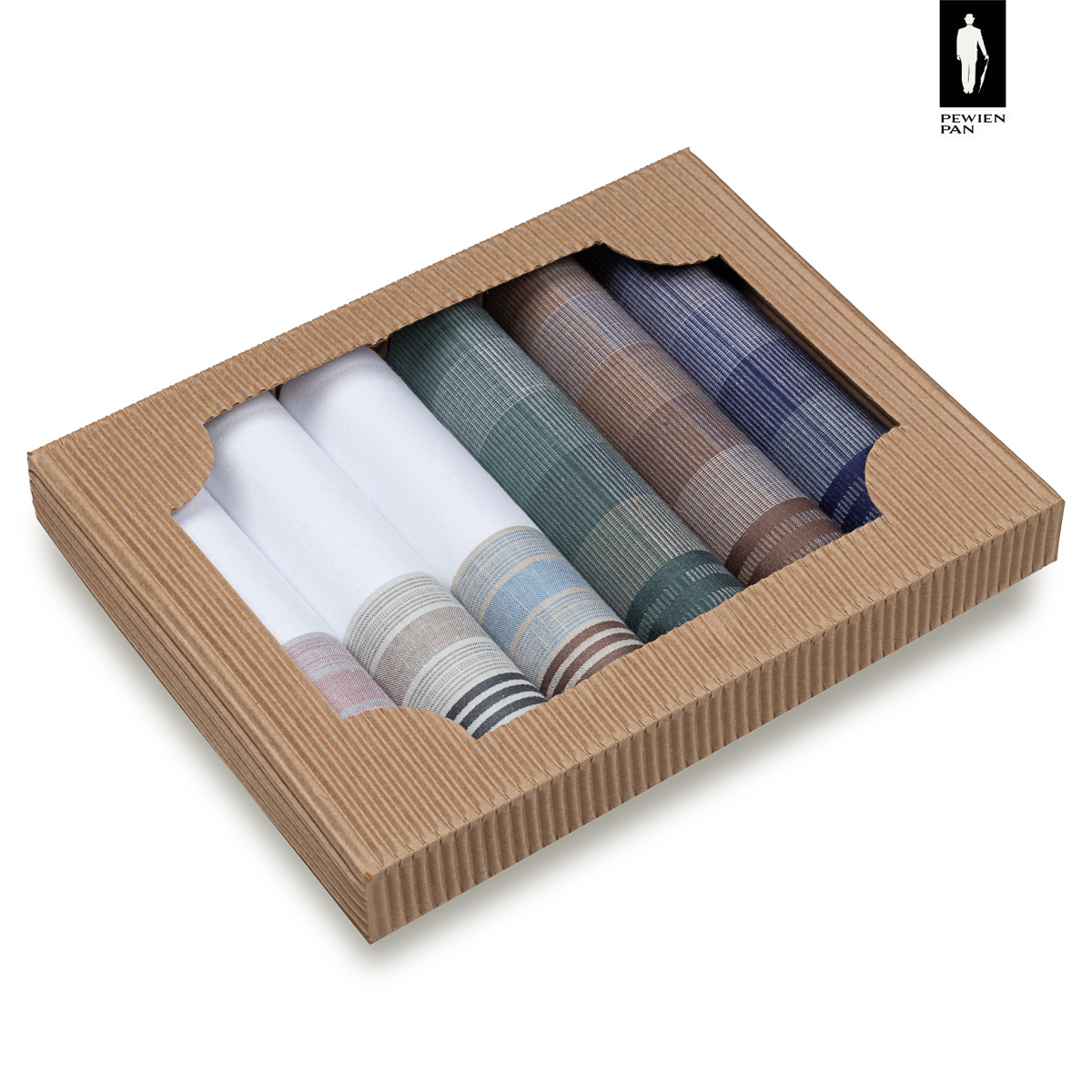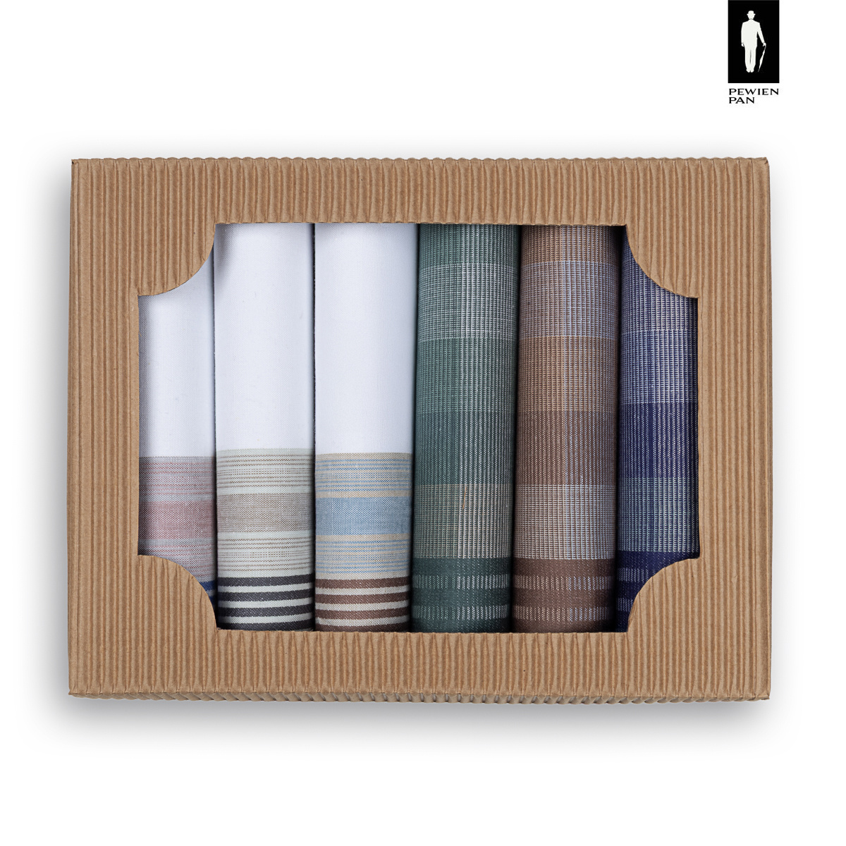 - Zestaw sześciu męskich chusteczek z bawełny – w paski i kratkę, w odcieniach błękitu, oliwki, brązu i granatu.