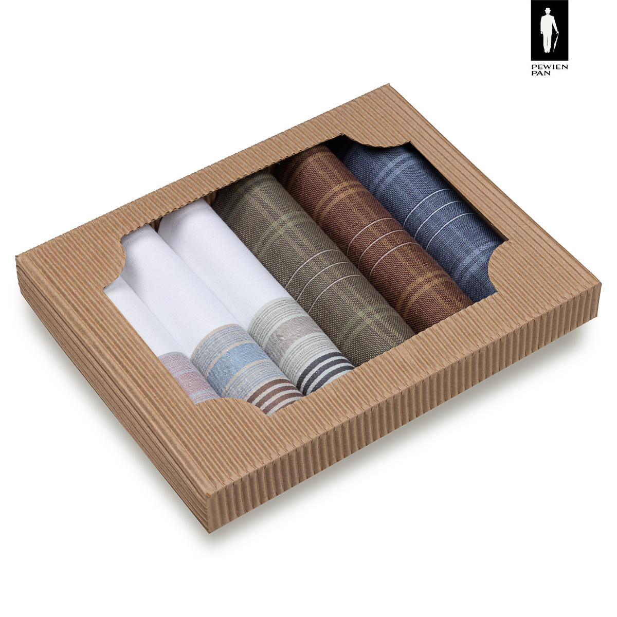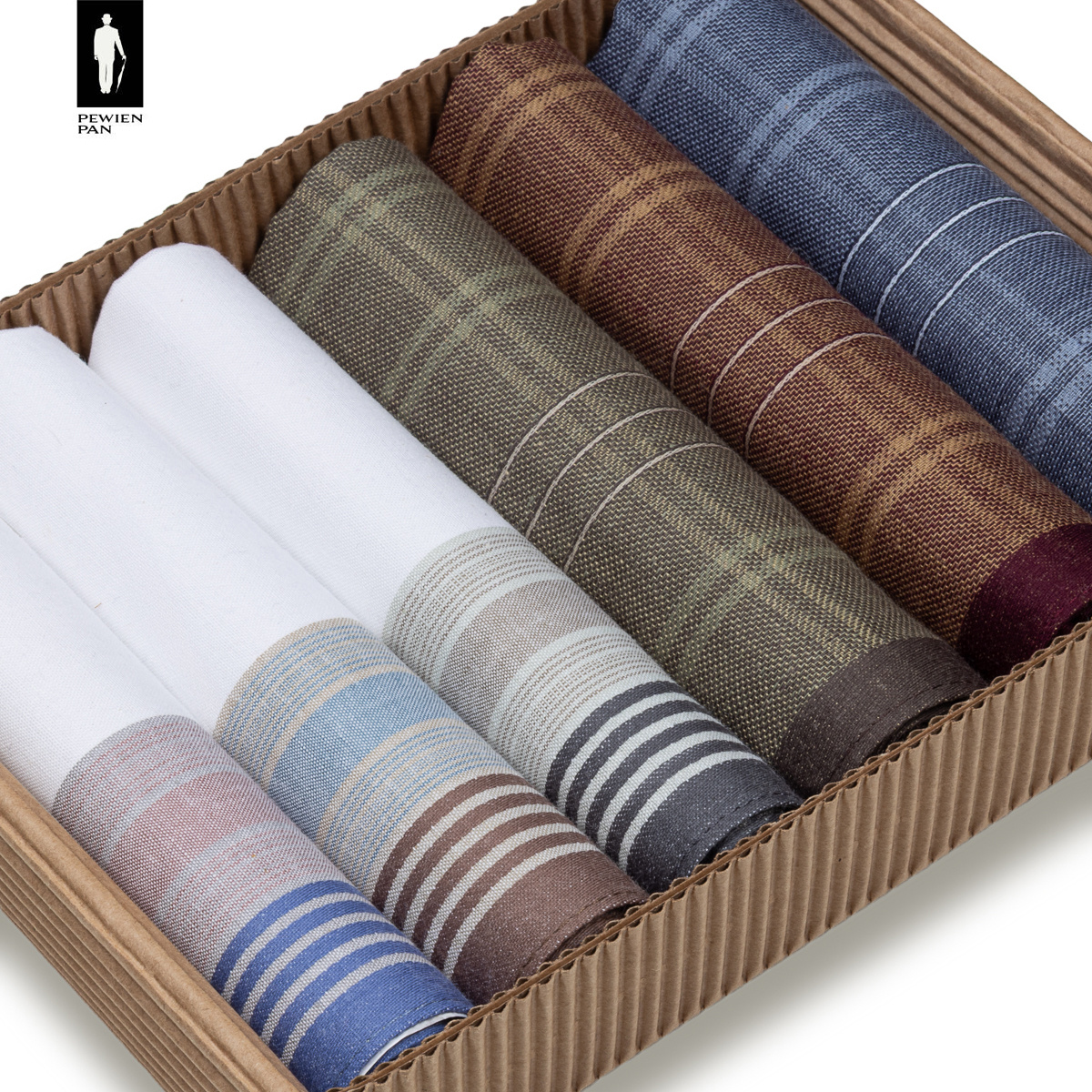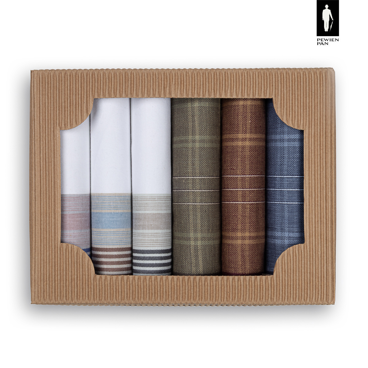 - Zestaw sześciu eleganckich, bawełnianych chusteczek męskich w paski i kratkę w odcieniach błękitu, oliwki, brązu i granatu.