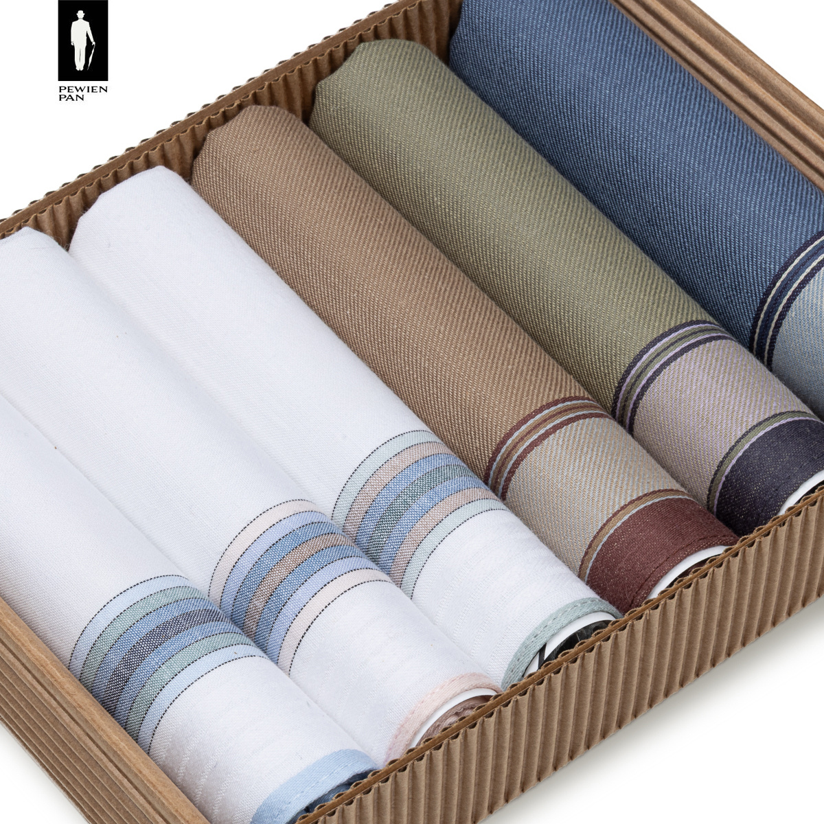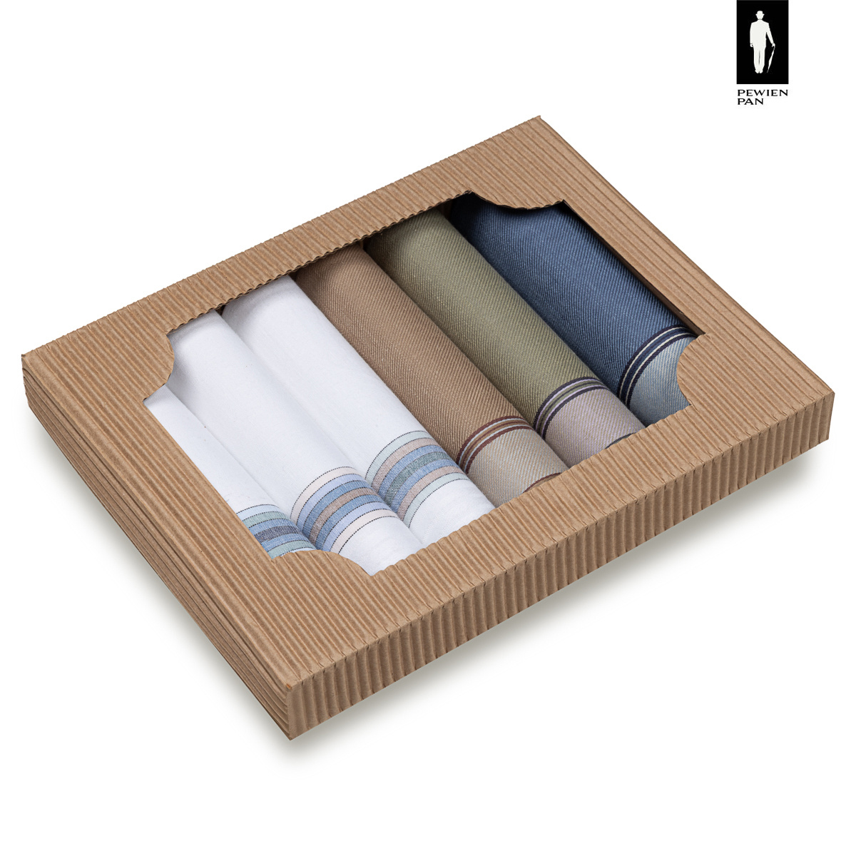 - Zestaw sześciu eleganckich chusteczek bawełnianych: białe w kolorowe paski oraz brązowa, oliwkowa i granatowa z szerokim pasem.